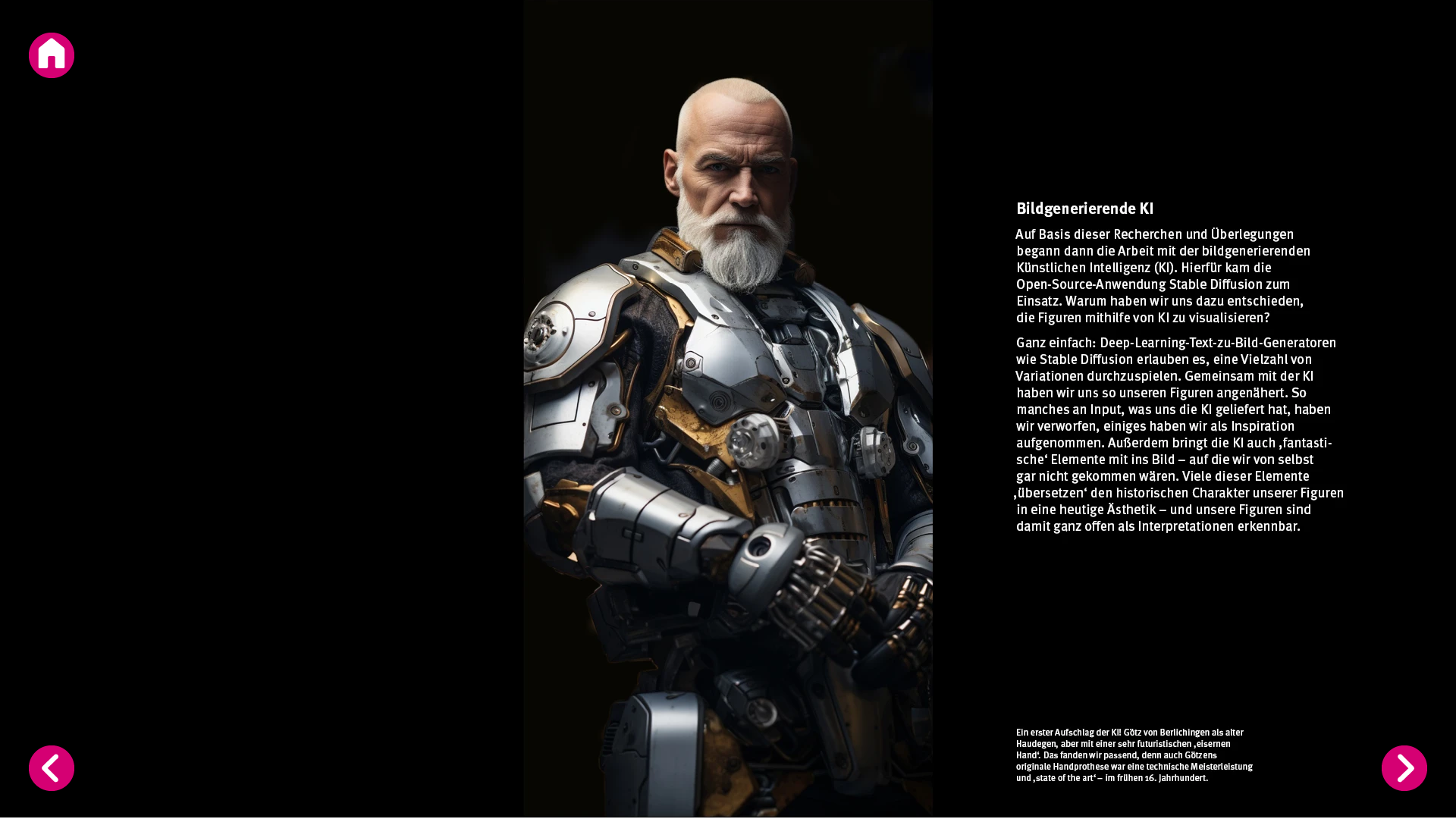 Lebensgroße KI-generierte Figuren lassen die Menschen aus den Bauernkriegen in einer unseren heutigen ästhetischen Sehgewohnheiten entsprechenden Weise erscheinen. Dadurch bekommt die Vermittlung der geschichtlichen Inhalte eine neue Aktualität.