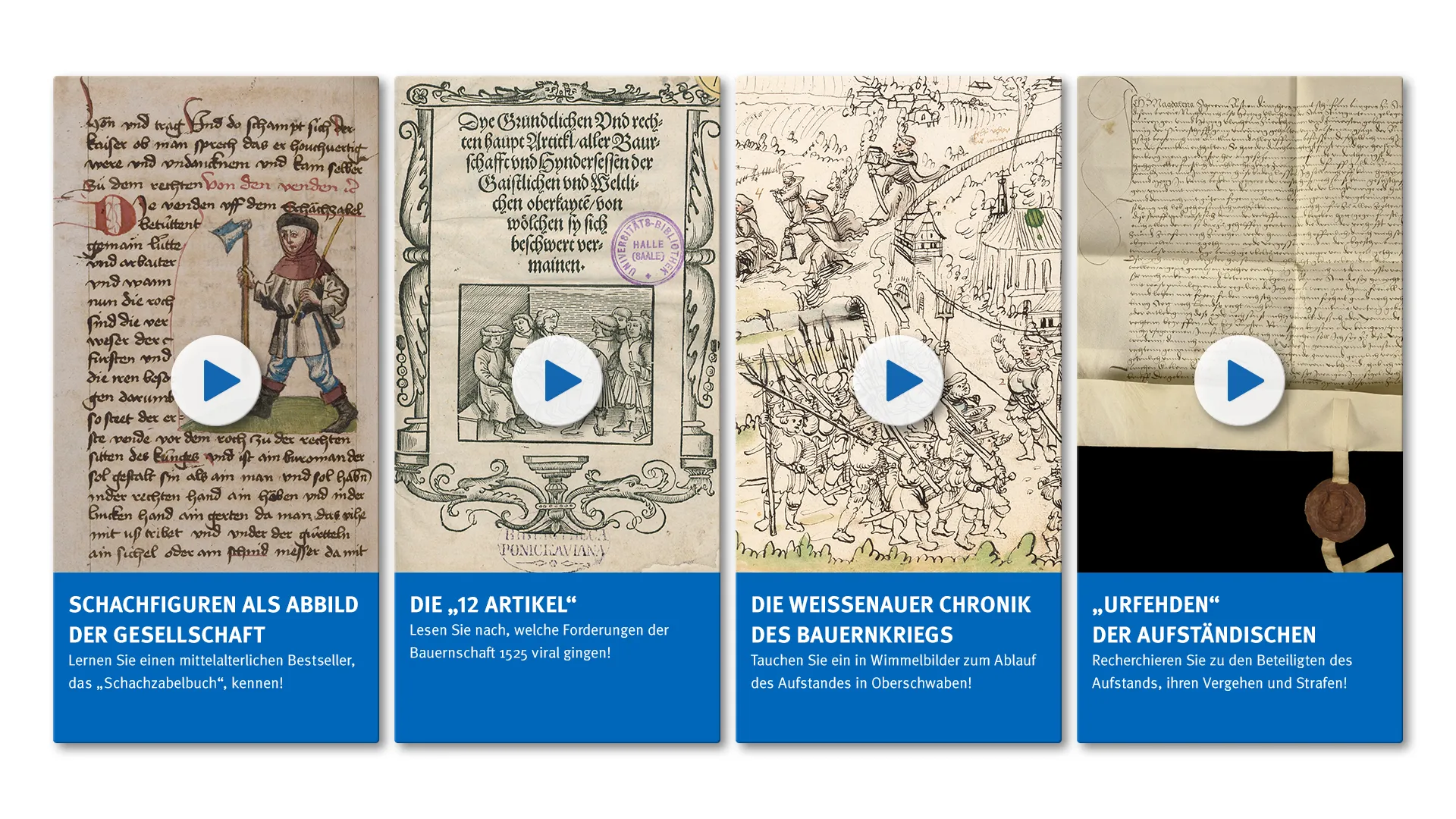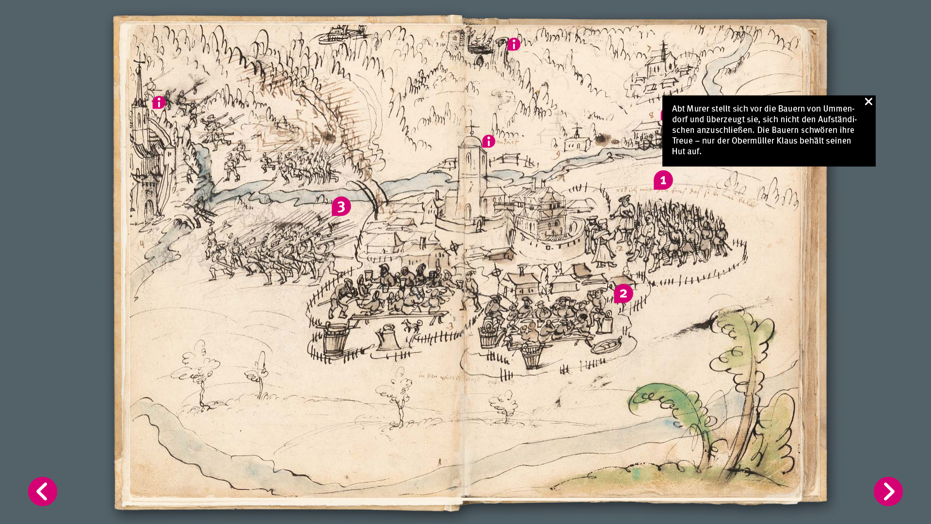 Die Geschehnisse der Aufstände wurden auch in zahlreichen Zeichungen wiedergegeben, z.B. im detailreichen Wimmelbuch der „Weißenauer Chronik“. Sie lässt sich durchblättern und ist mit vielen Infos zum Anklicken angereichert.