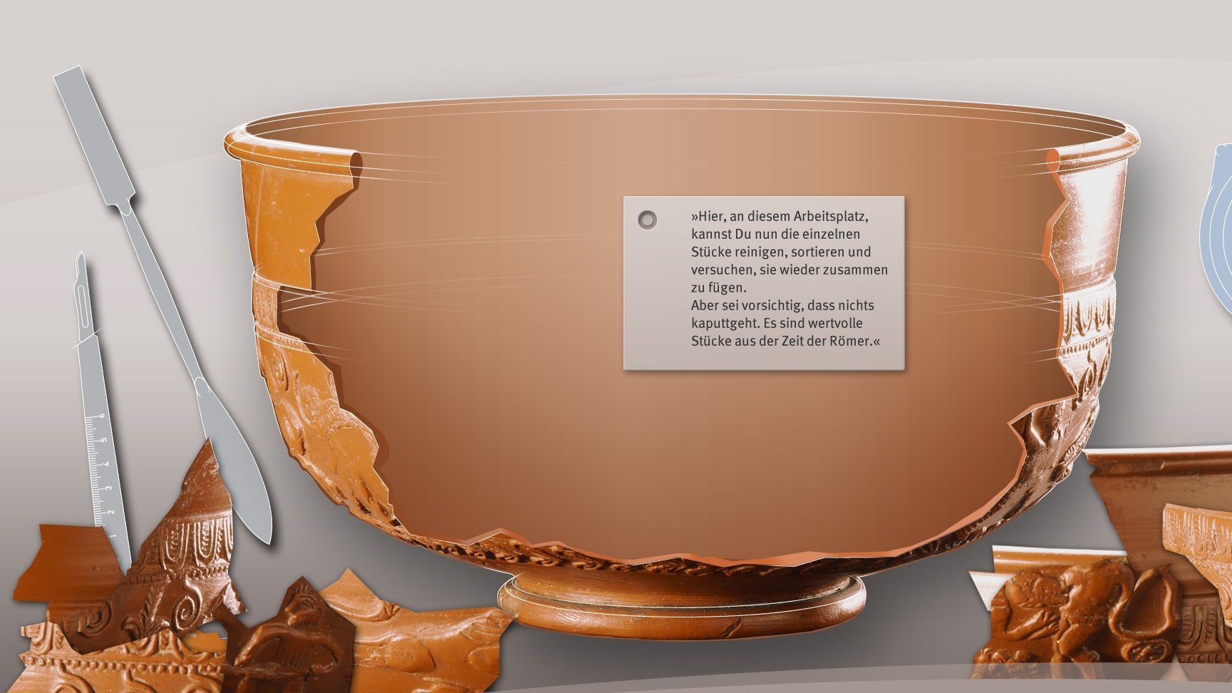 Ob steinzeitliches Bogenschießen, die Teilnahme an einer archäologischen Grabung, die Planung einer Reise auf Basis des römischen Straßennetzes oder die Ausstattung von Göttern mit den passenden Accessoires: Die Besucher tauchen in die Lebenswelt vergangener Zeiten ein und erfahren Geschichte auf spielerische, innovative und gleichermaßen unterhaltsame Weise.